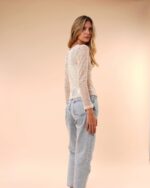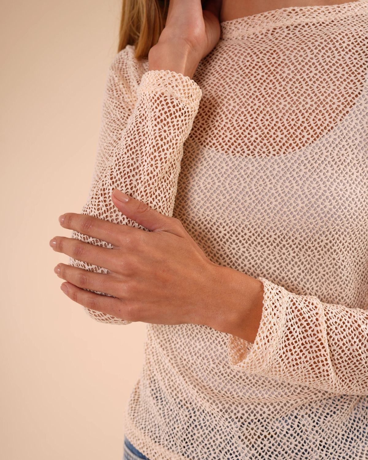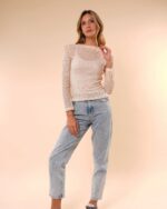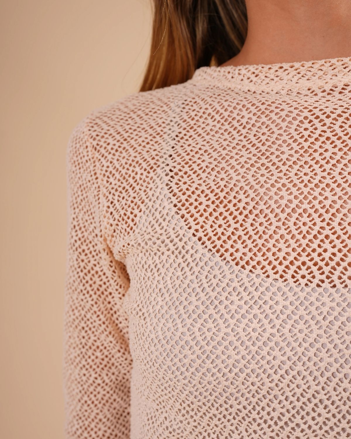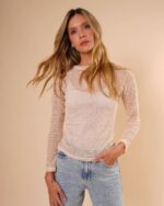Ligera, fresca y con un aire delicadamente sensual. Esta camiseta de manga larga está confeccionada en una malla fina y suave que deja ver sutilmente la piel, perfecta para crear looks en capas. Su fit ajustado estiliza la silueta sin perder comodidad, convirtiéndola en una prenda versátil para usar tanto de día como de noche.