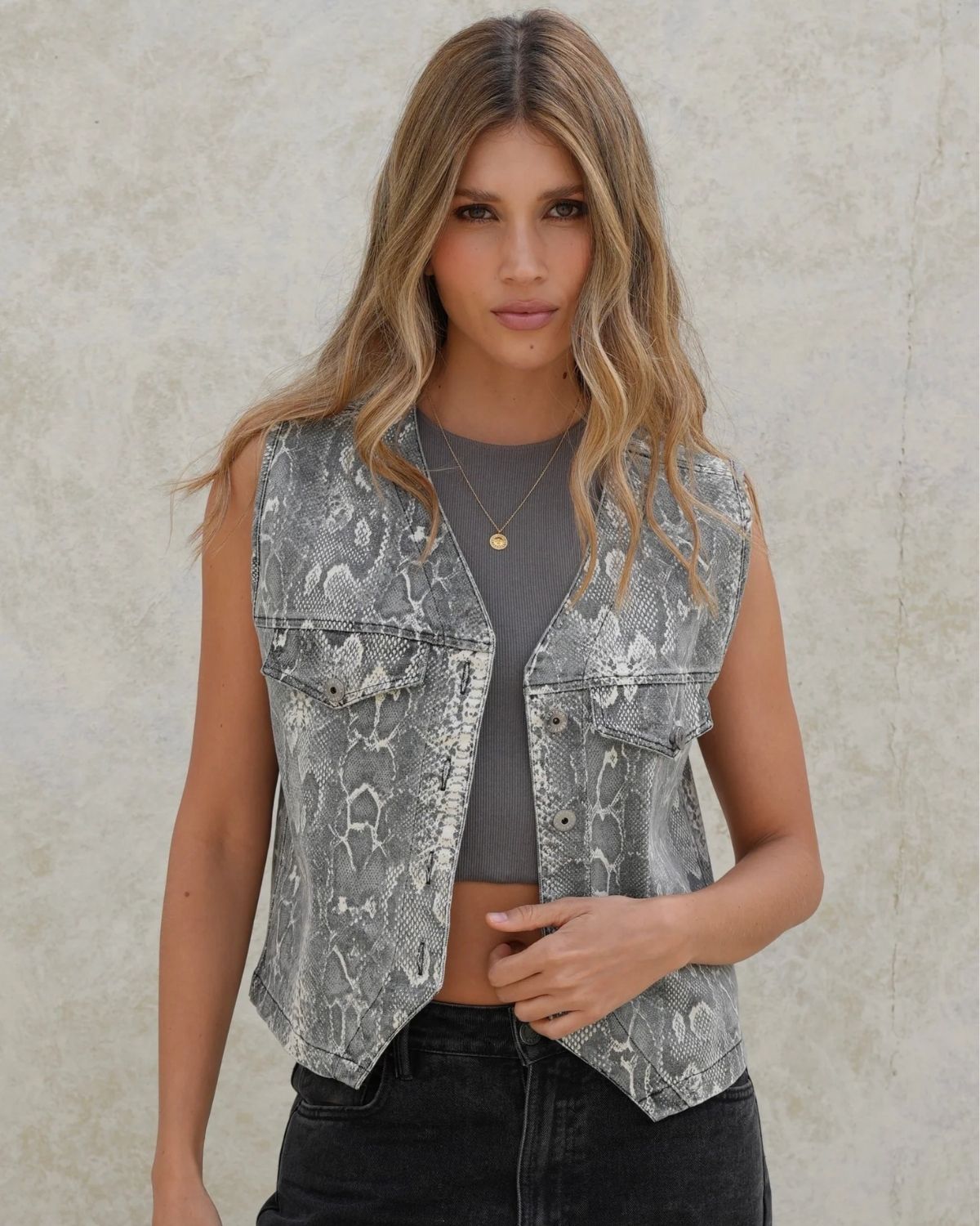 El Chaleco Boa es una pieza complementaria y versátil en tela drill, perfecta para agregar estilo cualquier look.