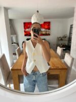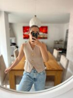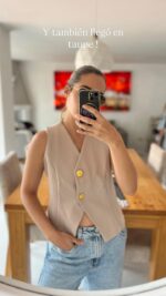 Este chaleco te va a encantar, te recomendamos pedir una talla màs de la habitual porque son ajustados. La modelo està usando talla L.