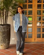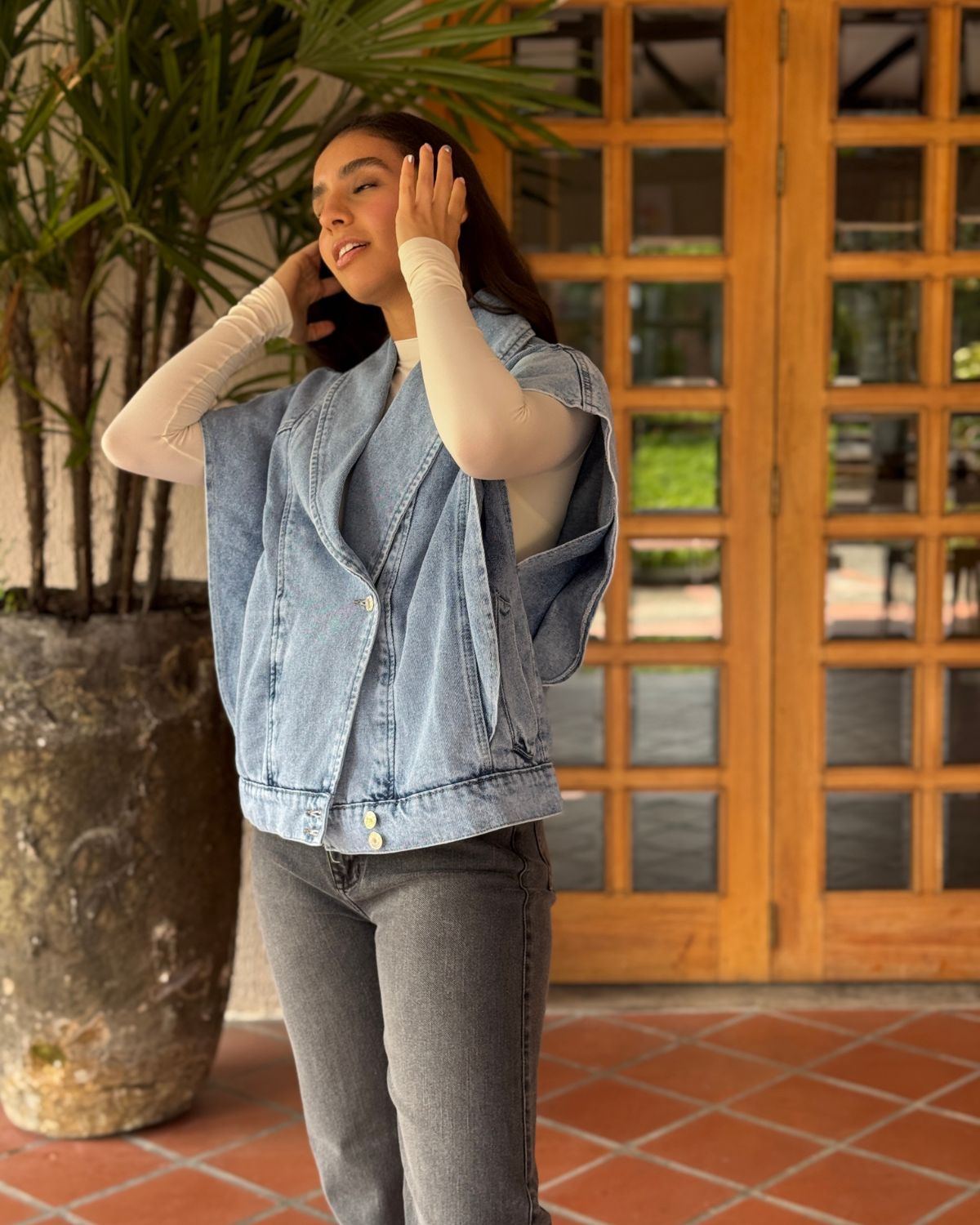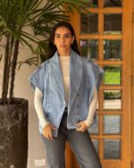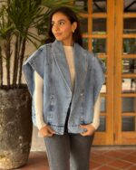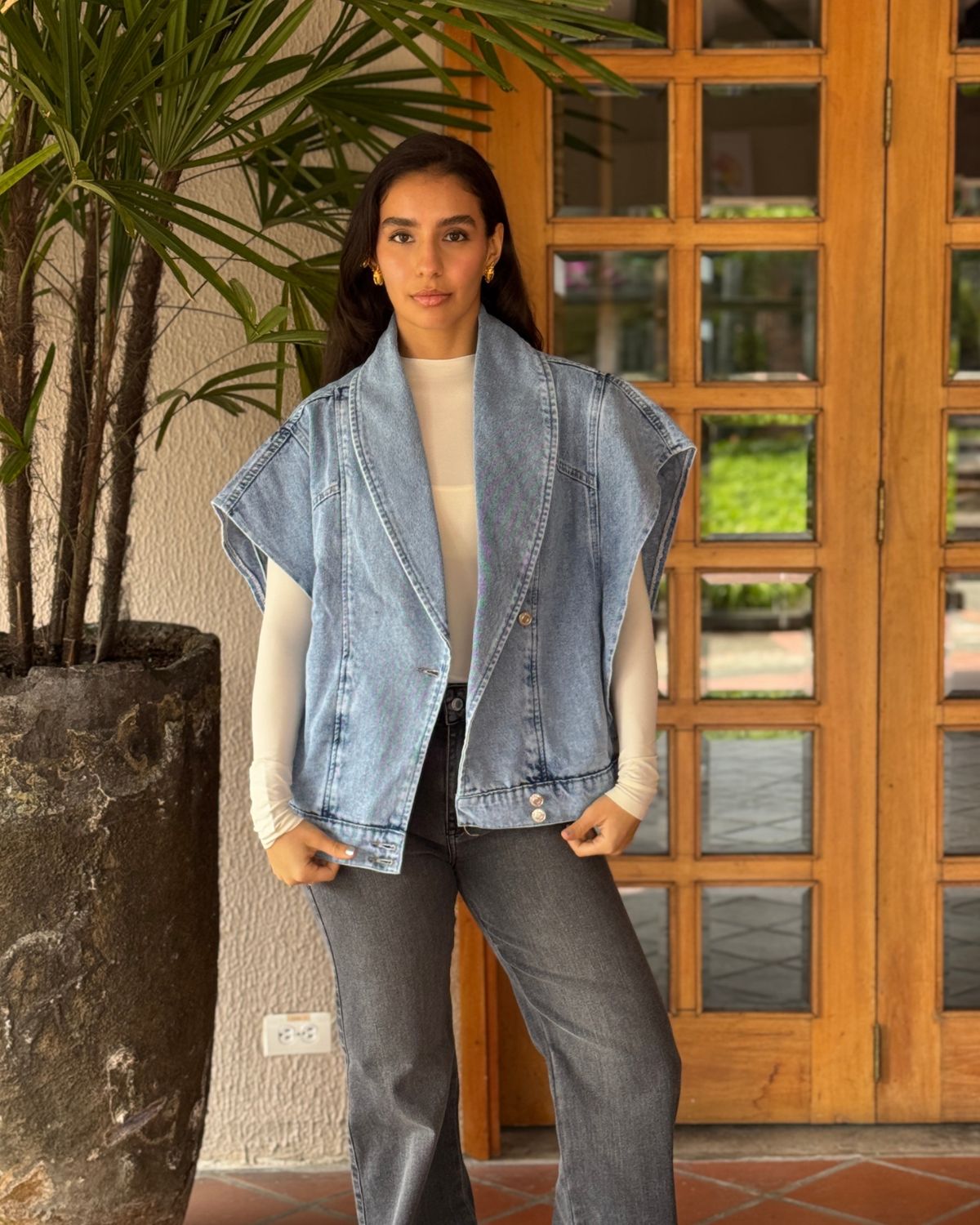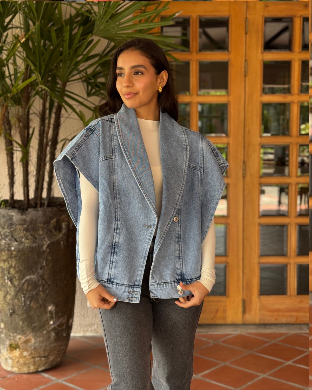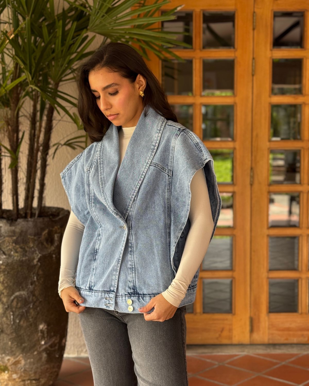 Este chaleco es todo lo bien que està en la vida, en denim y silueta oversize con efecto hombreras. Puedes usarlo abierto o cerrarlo a los botones laterales.