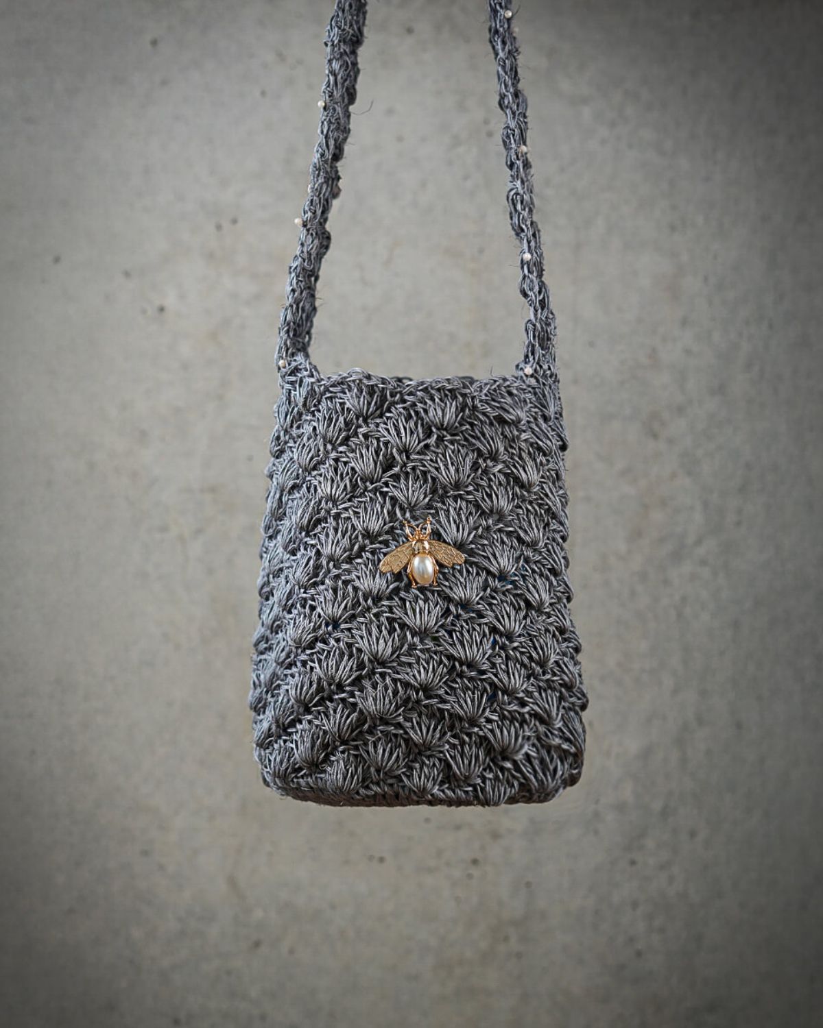 Esta mochila se elabora en hilos de yute con perlas en el asa acompañada por nuestra Abeja perla evocando tradición , dulzura y fuerza femenina. Terminados en piedra de Murano.