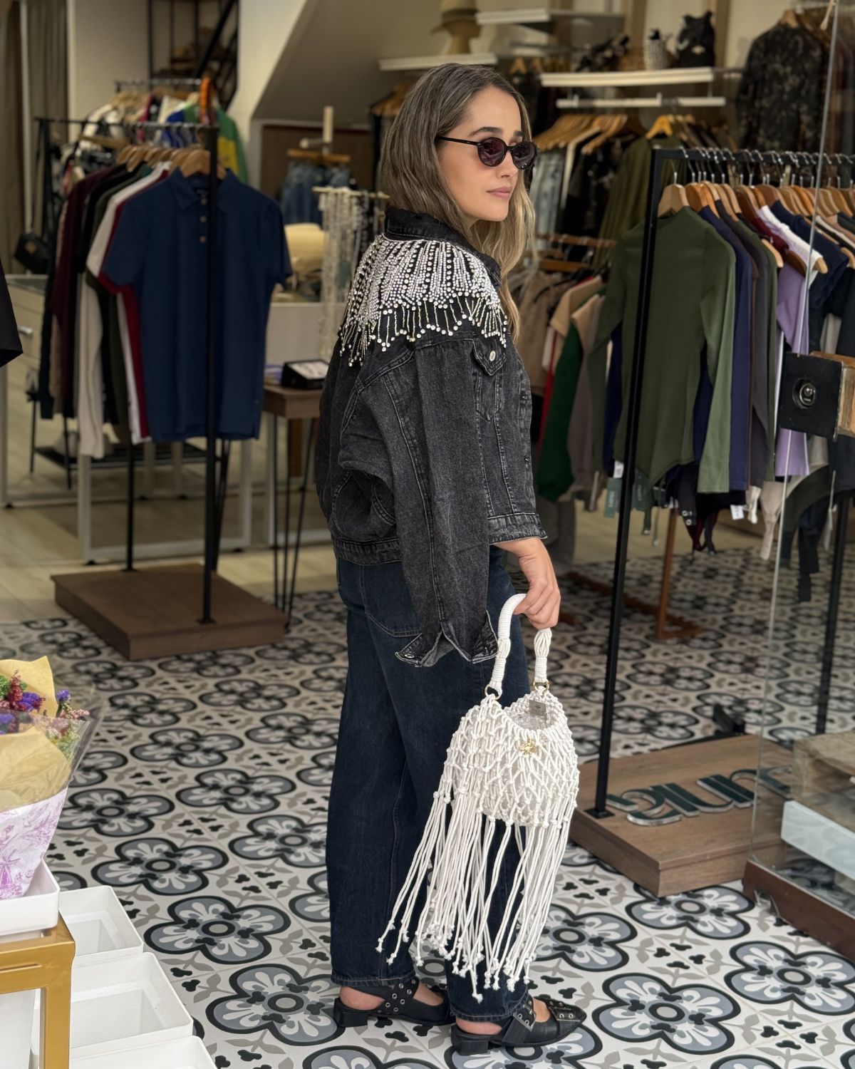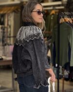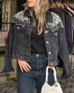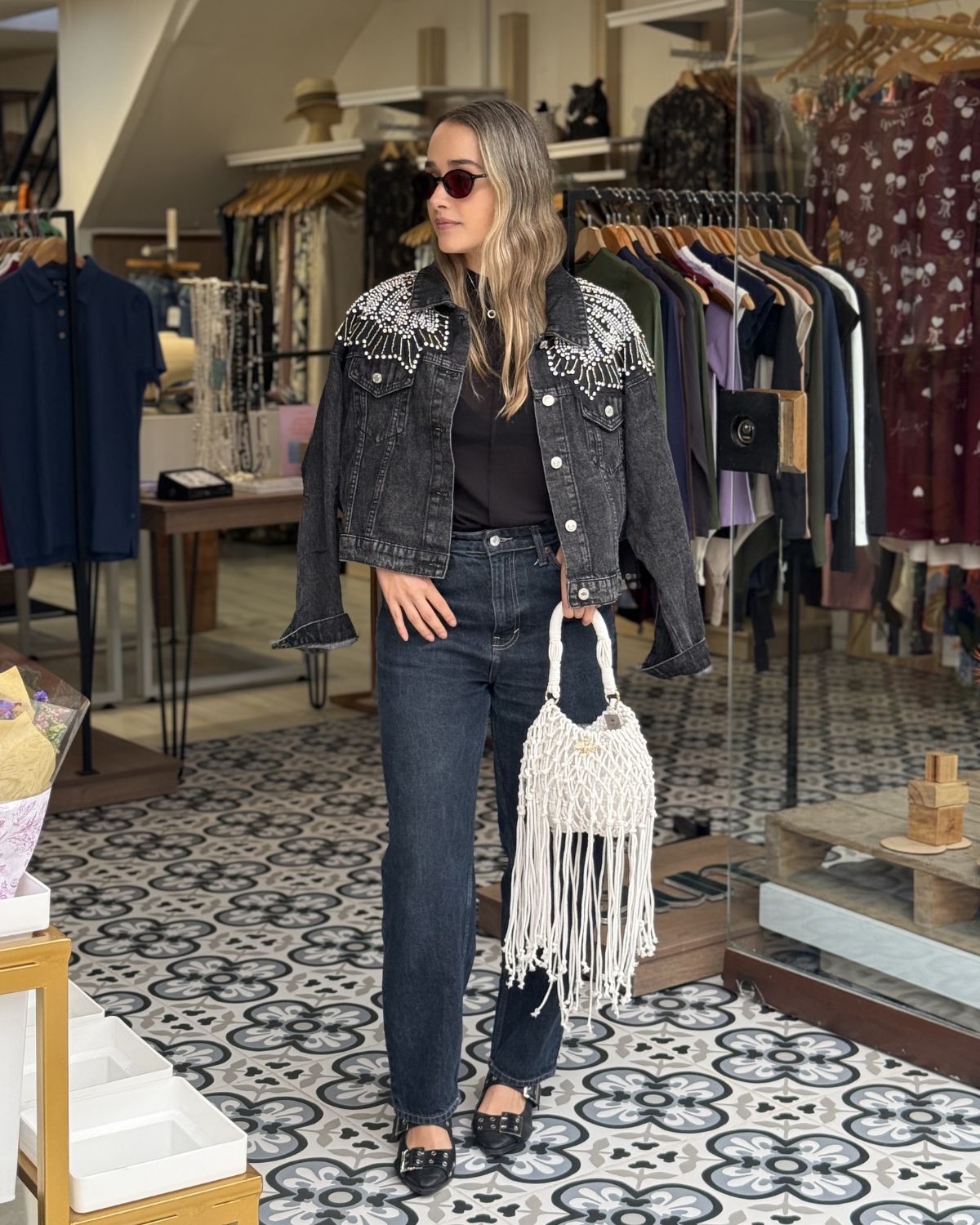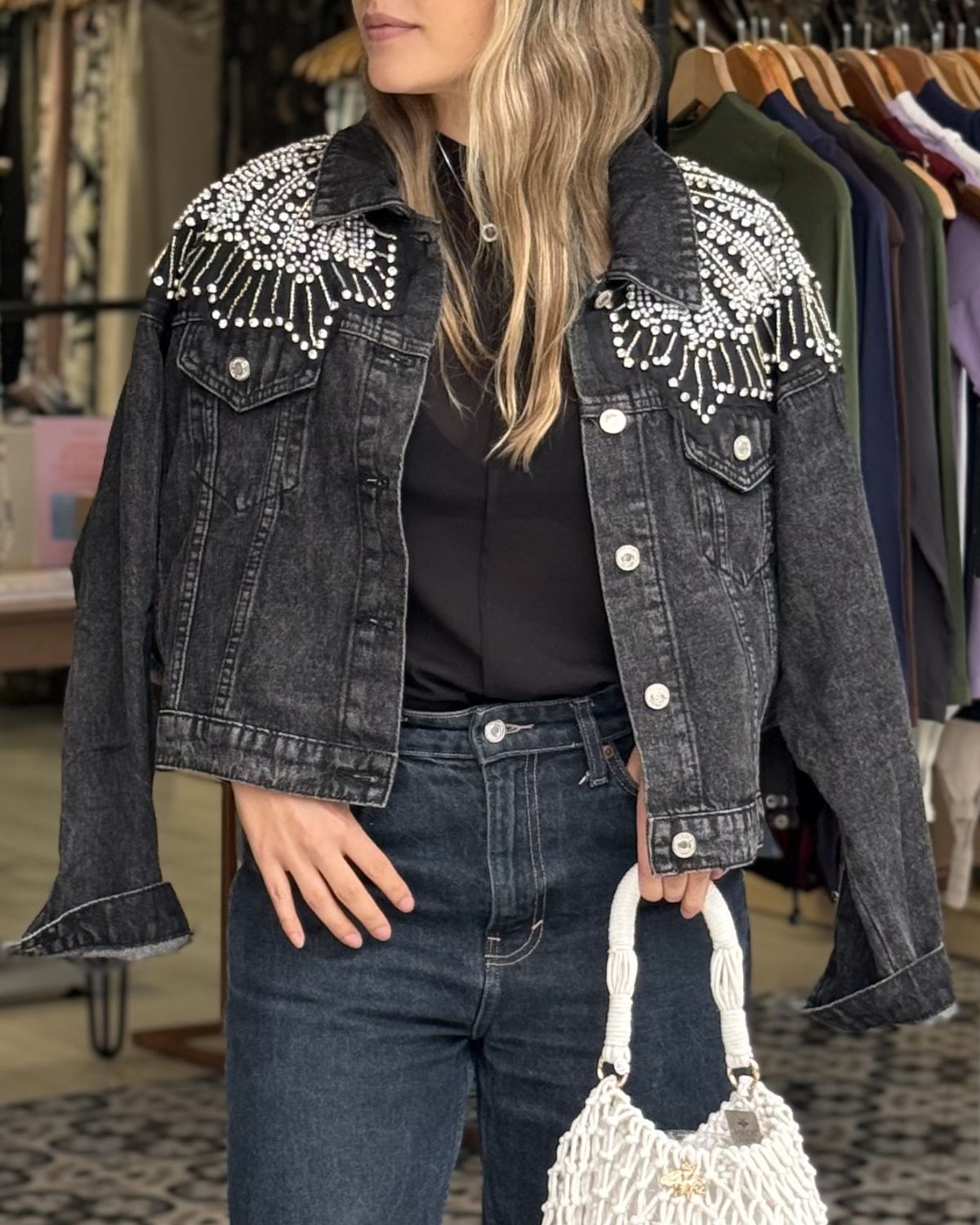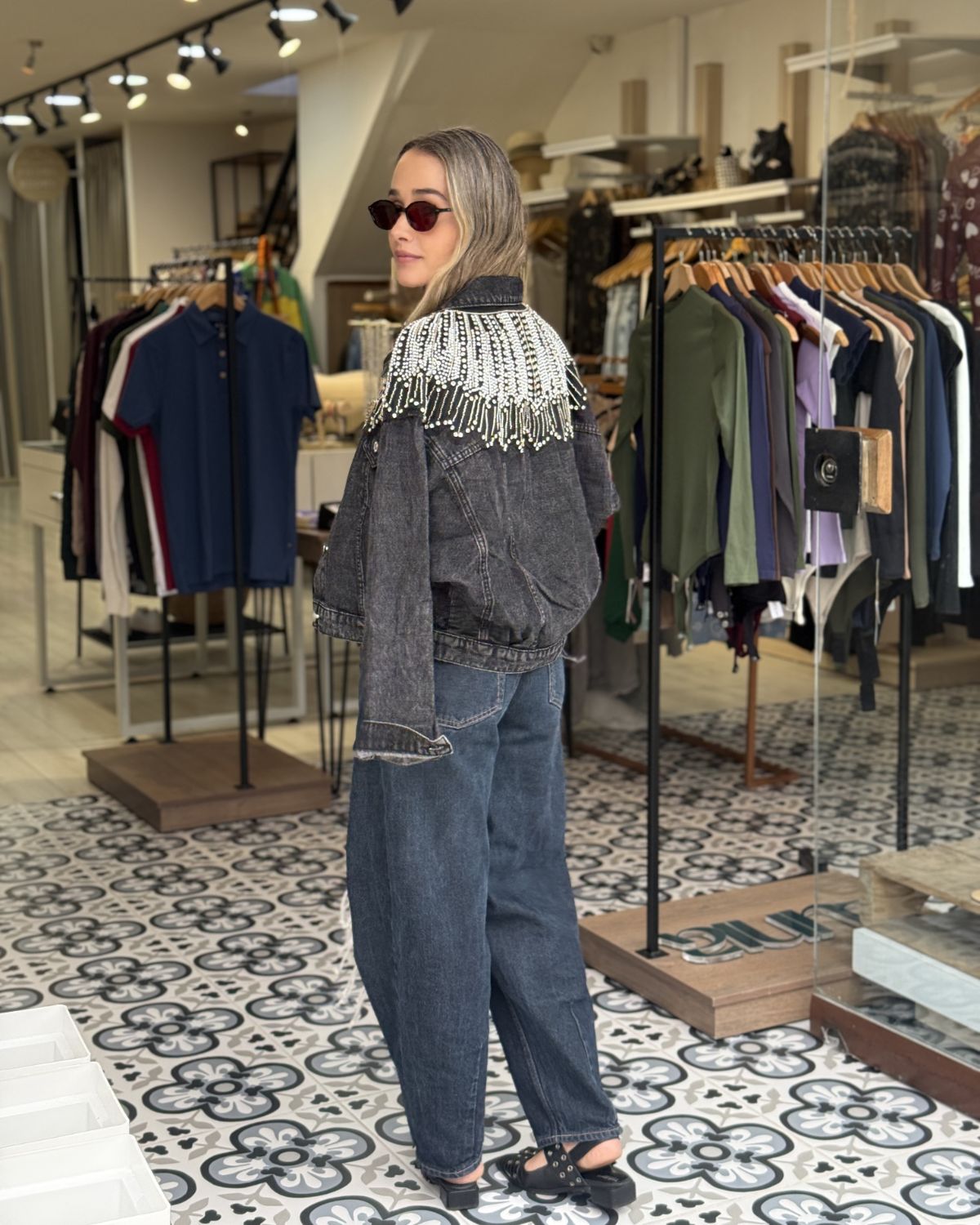 Chaqueta de Jean negra con customizada con apliques que la hacen unica.