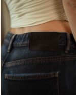 Jean con fit barrel elaborado en denim rígido azul oscuro con efecto de resina en frontal y posterior. Pretina con pasadores, cierre frontal con cremallera y botón metálico.