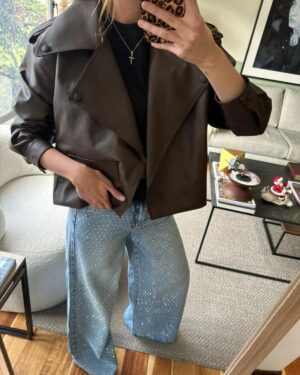 Chaleco overdye en tono crema, silueta semi fitted y escote profundo en V. detalles de apliques metálicos en los bordes y en frontal con forma de estrella. Diseño sin cierre para uso abierto y caída en pico.