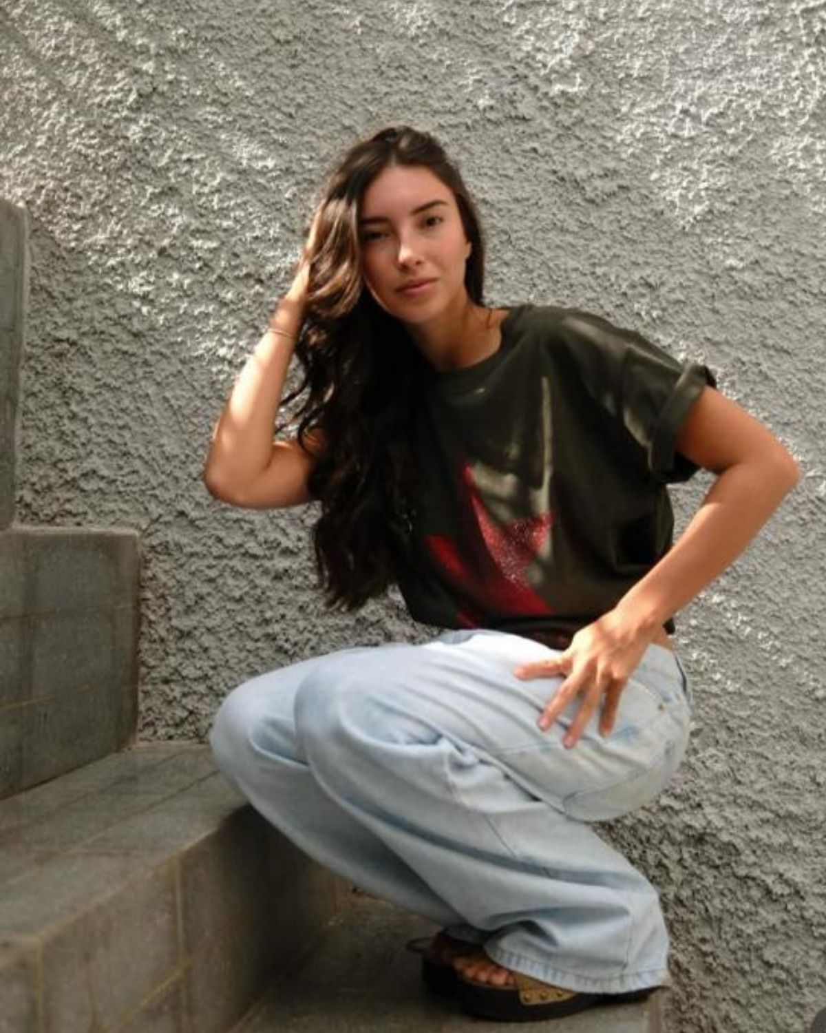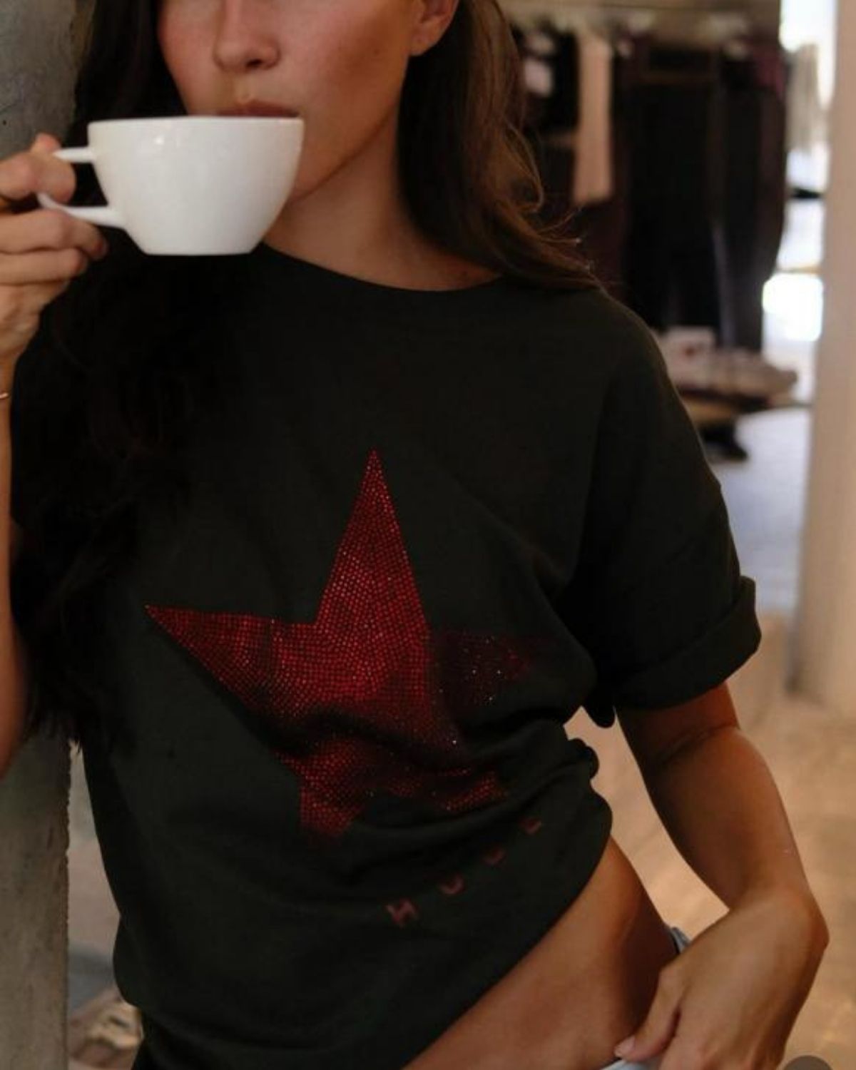Camiseta en tono verde oscuro, cuello redondo, manga corta, fit amplio, apliques de piedra en forma de estrella color vino y texto estampado en el delantero.